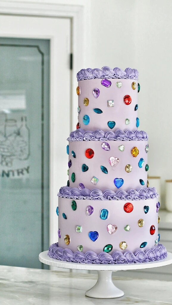 Para esta fiesta, la familia eligió una torta de tres pisos, decorada con crema azul y decorada con gemas de colores. Este tipo de pasteles llamados jewell cakes es lo que se viene en repostería 2026 y consisten en decorar el bizcochuelo con cristales comestibles (elaborados con azúcar o glucosa).