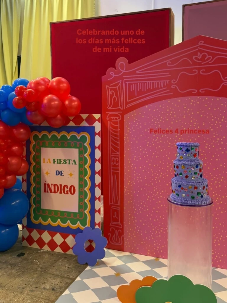 En cuanto a la decoración, contó con guirnaldas de colores confeccionadas en papel, en sintonía con la estética árabe elegida. La escenografía se destacó por tener colores vibrantes, formas lúdicas y detalles que remiten a un mundo de fantasía. La paleta combina rojos intensos, azules profundos y dorados, evocando ese clima cálido y exótico.