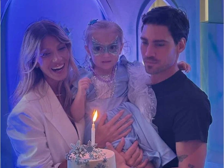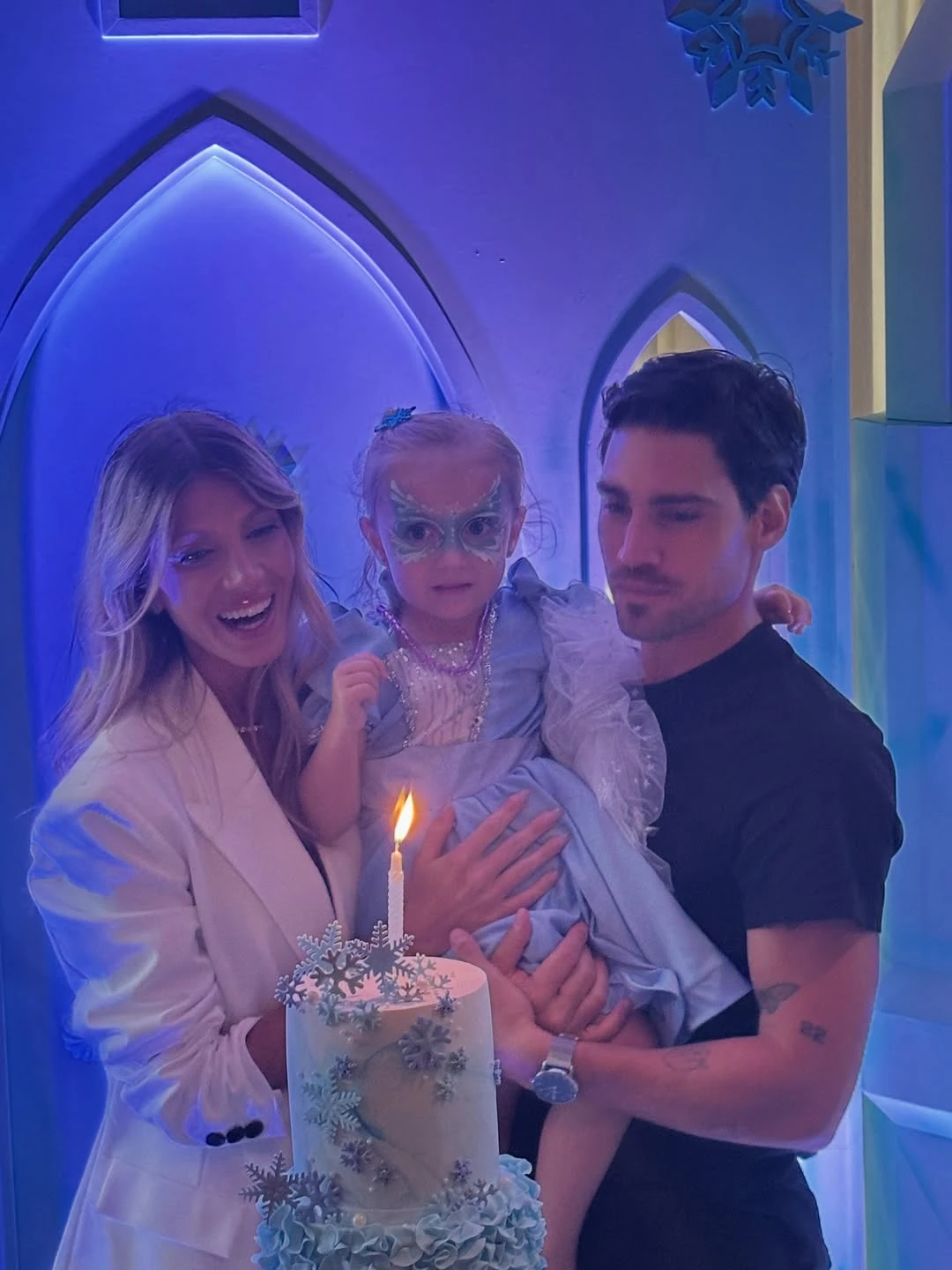 En el momento del “feliz cumpleaños”, Candela y Nico sostuvieron a Vita frente a una delicada torta de dos pisos, decorada en tonos celestes y blancos, con detalles de copos de nieve y una vela encendida en la parte superior. La escena estuvo cargada de ternura, con los padres acompañando a su hija mientras todos aplaudían alrededor.