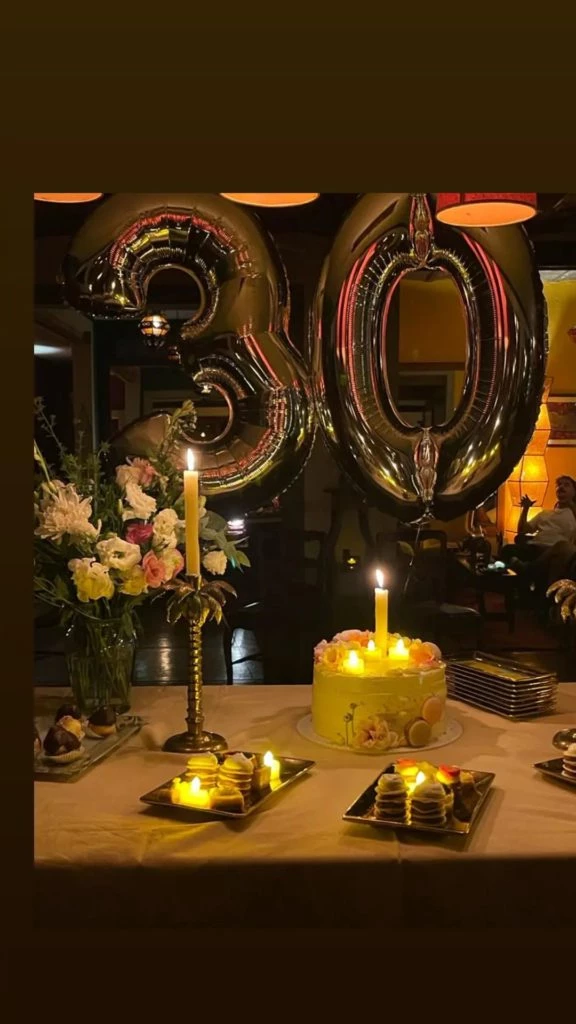 La mesa donde estuvo el pastel se destacó por tener enormes globos plateados con el número 30, velas prendidas, flores y algunas bandejas con masitas dulces.