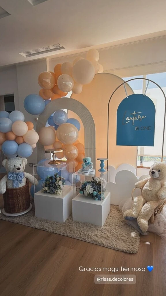 La escenografía contó con arcos y estructuras curvas con la frase "Lautaro is one". Y hubo globos en diferentes tamaños, en color mate y transparentes, que dieron volumen y movimiento. A esto le sumaron elementos básicos del universo infantil, como osos de peluche, globos aerostáticos y arreglos florales que aportan calidez.