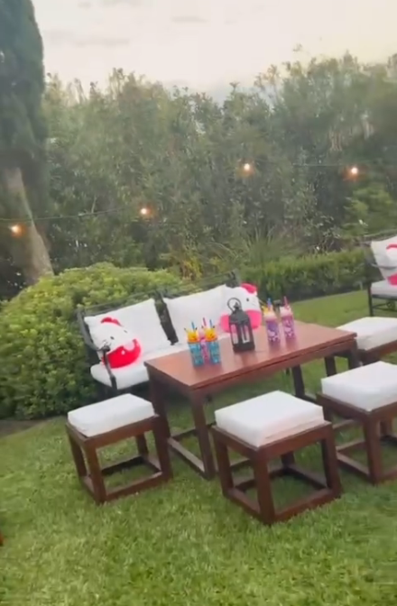 Sobre uno de los laterales, se dispusieron mesas y sillas con almohadones coloridos de la famosa gatita.