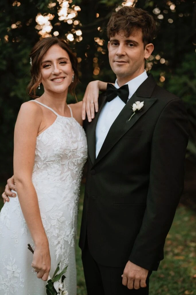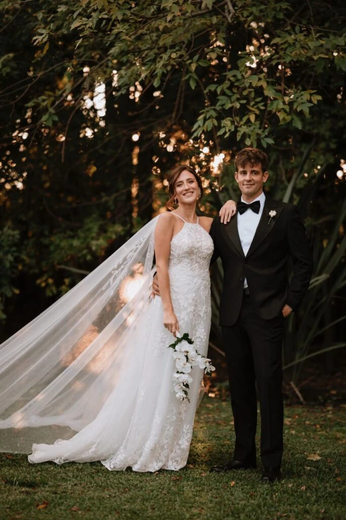 Por otro lado, los zapatos fueron de Sylvie Geronimi, el ramo fue una creación de Betty Izzo y los aros fueron de la casa Furman Jewels. En cuanto al Covini, llevó un traje negro clásico con moño, luciendo como detalle un boutonnière. Se trata de un adorno floral y tradicional que suelen usar los novios para distinguirlos en su día especial.