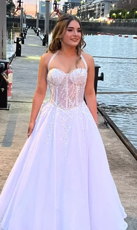 Más tarde, cambió por un modelo corto, moderno y cómodo, con mucho brillo, ideal para disfrutar la pista de baile. Este segundo look le permitió sumarse a los juegos, bailar con sus amigas y vivir la fiesta al máximo.