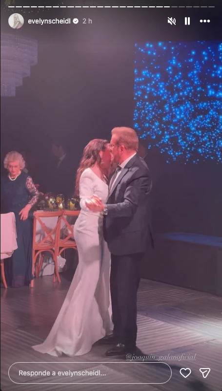 Luego del vals, la novia sorprendió con un cambio de look: optó por un vestido blanco más fresco, con mangas cortas caídas sobre los hombros y silueta tipo wrap dress, ideal para disfrutar de la pista.