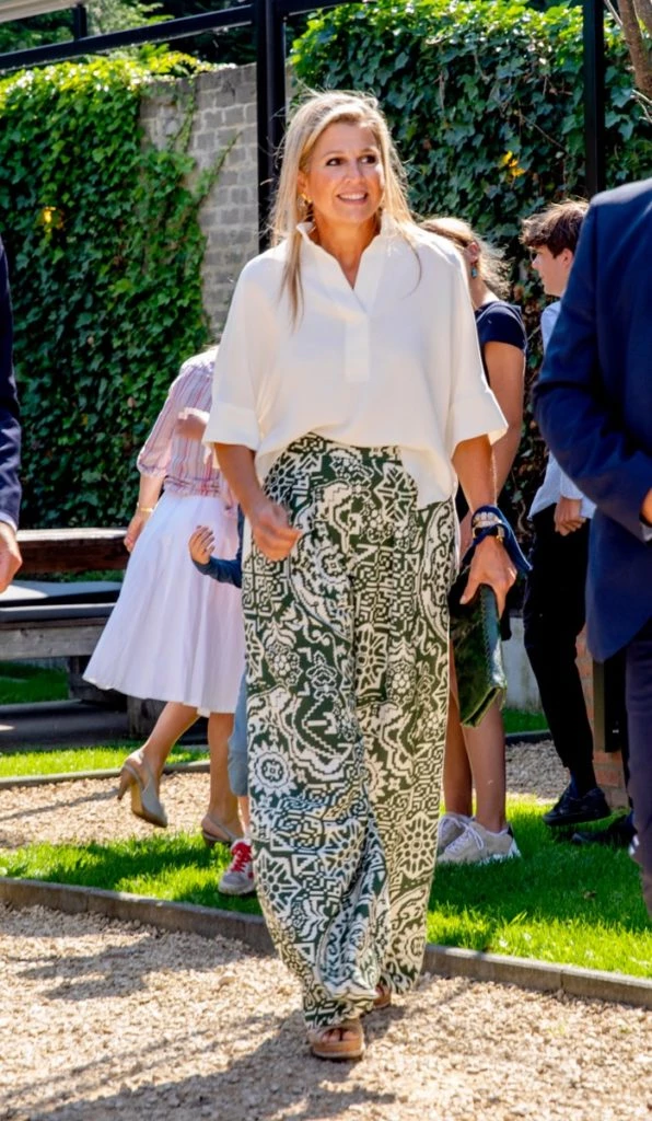 Máxima decidió adoptar el color verde de una manera muy chic, llevó unos pantalones anchos con estampado de búlgaros y los combinó con blusa blanca.