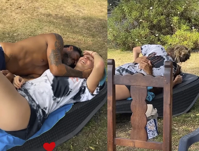 En otra secuencia, porque hubo otro video, la pareja se mostró muy hot también recostados en una reposera, mientras Viciconte reposaba sobre el cuerpo de Cubero. Estirando su remera para taparse, la mamá de Luca Cubero no llegó a notar que su hermana la estaba filmando y siguió adelante con su sesión de mimos, apenas tapada por los árboles del jardín de la casa de sus suegros, Carlos y Ángela Cubero.