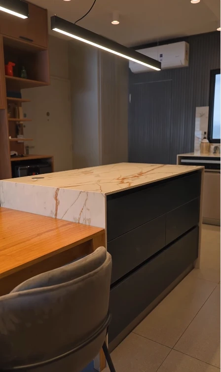 El espacio combina muebles de melamina en tonos roble con una isla central de mármol que estructura el ambiente y funciona como punto de encuentro. Además, incorporó un sector de coffee bar, una cava de vinos y una televisión, integrando así funciones prácticas y sociales en un mismo lugar.