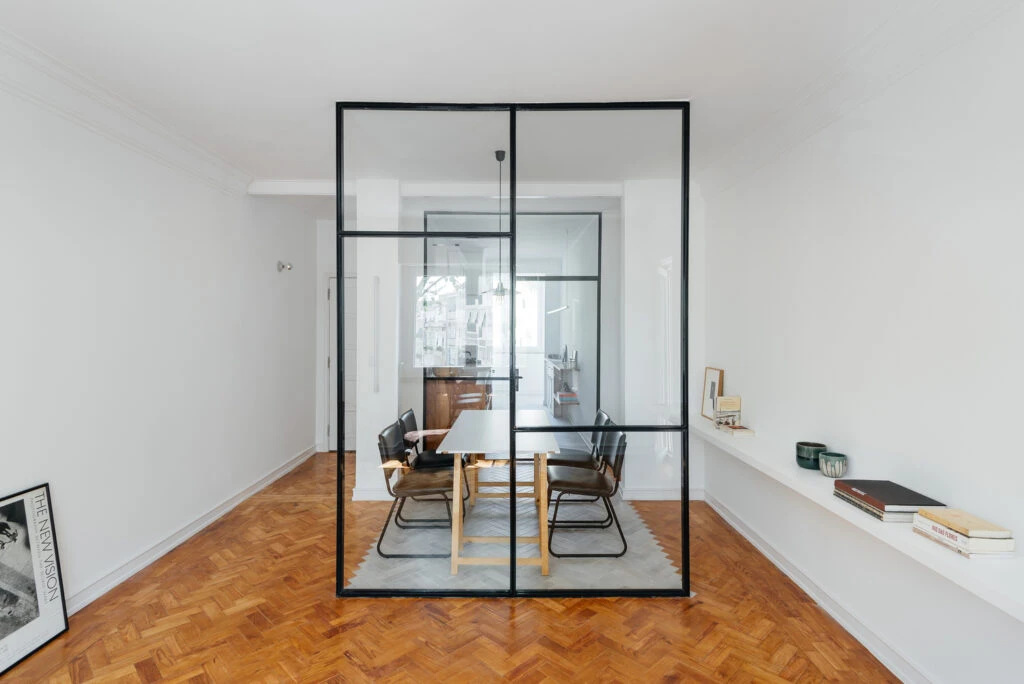 La nueva delimitación de las áreas se crea a través de dos grandes vanos de ventanas de hierro que separan el living del comedor y la cocina, manteniendo la conexión visual y acentuando la profundidad del espacio.