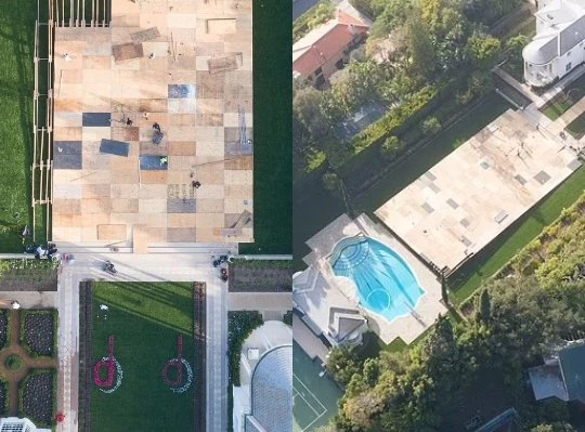 Las fotos aéreas publicadas por el Daily Mail el lunes muestran una enorme pista de baile de madera que se está instalando en la propiedad del difunto abuelo de Paris, Barron Hilton.