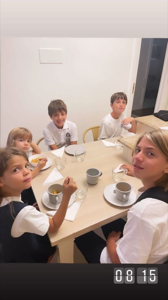 Primero fue el momento del desayuno: Constantino, Benedicto, Valentino, Isabella y Francesa con sus uniformes, comiendo cereales antes de partir al colegio.