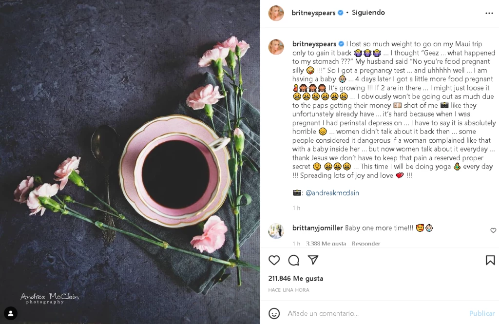 Enseguida, sus fans comenzaron a especular con la posibilidad de se trate de una nena en camino, dado que la foto que usó Spears para dar la feliz noticia contiene rosas color rosa, así como una taza y un plato en ese mismo color. Y, en su posteo anterior, compartió tres imágenes donde se la ve con una remera rosa.