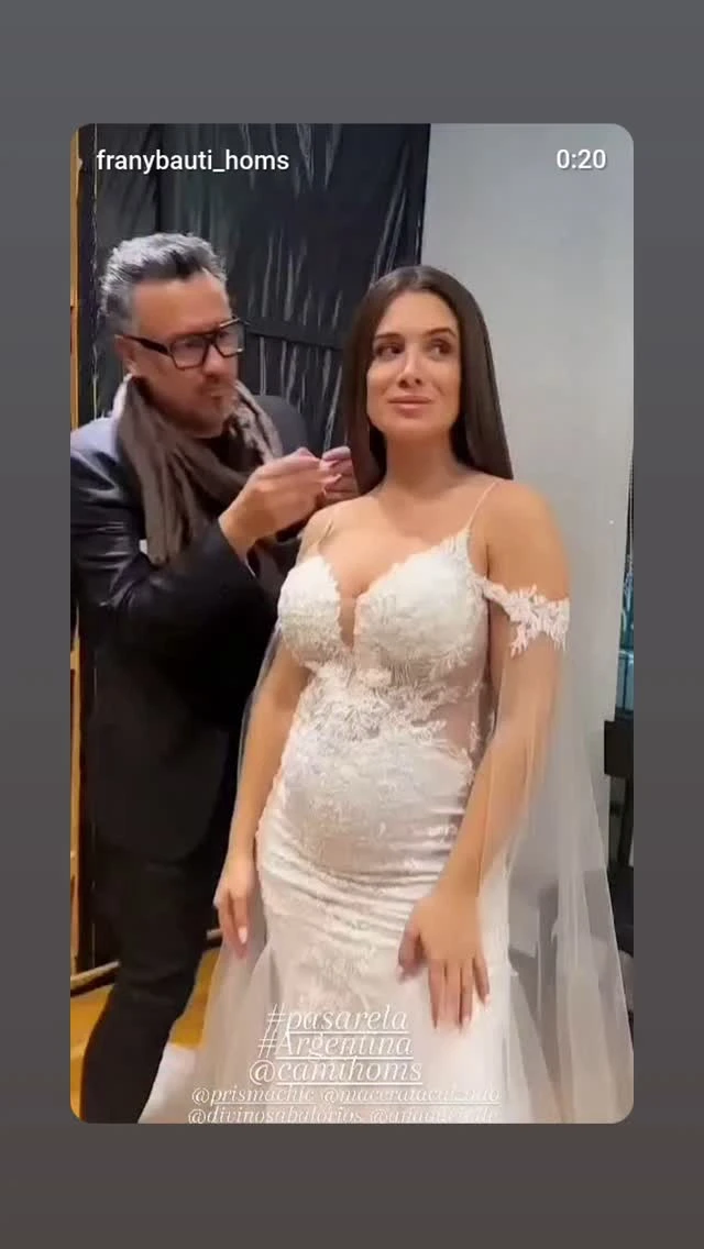 Uno de los grandes protagonistas del look son las largas caídas de tul que parten desde los hombros, simulando una capa etérea que aporta movimiento y un aire de cuento de hadas. Para completar este look bridal, Homs optó por un maquillaje natural y luminoso, resaltando sus facciones con tonos nude, y un peinado lacio con raya al medio, que potencia la elegancia y la frescura del conjunto.