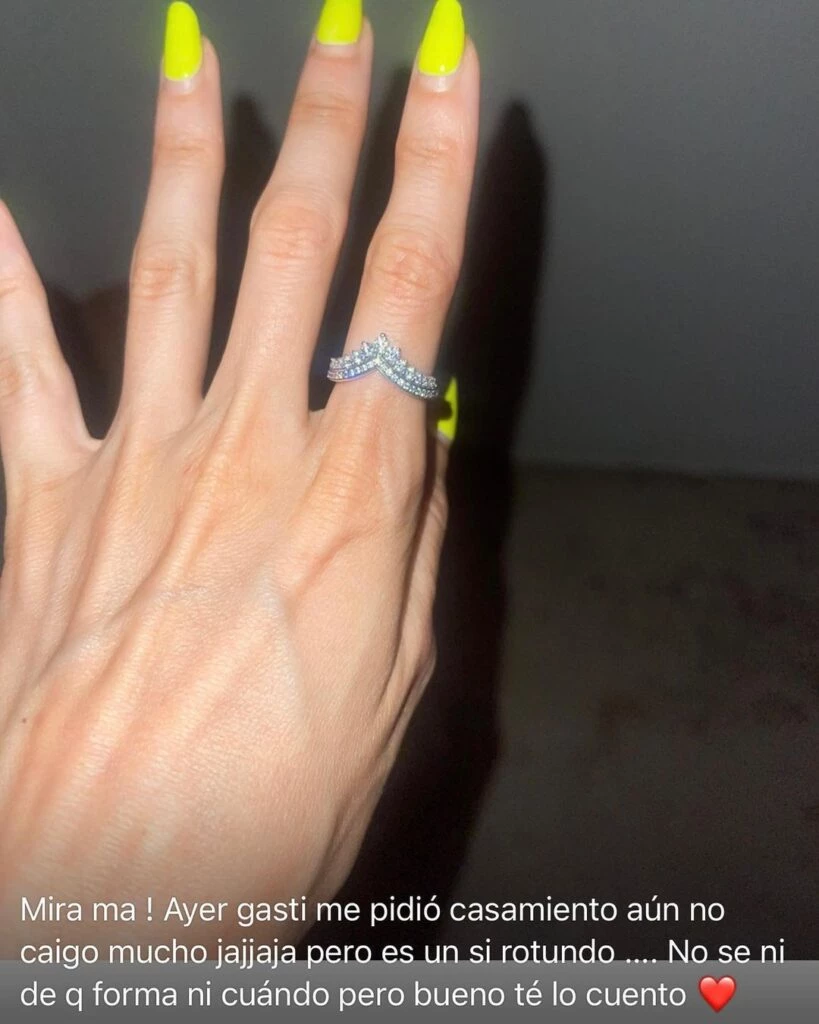 A través de sus redes sociales, Cande compartió su anillo de compromiso por primera vez a sus seguidores, ya que nunca antes se había fotografiado con éste. "Mirá ma. Ayer Gasti me pidió casamiento, aún no caigo pero es un sí rotundo. No sé ni de qué forma ni cuándo pero bueno te lo cuento", había expresado la actriz, en un diálogo con su mamá, que publicó en la red social Instagram. Se trata de un anillo en forma de corona curva, con detalles de piedras brillantes, realizado en oro y plata.