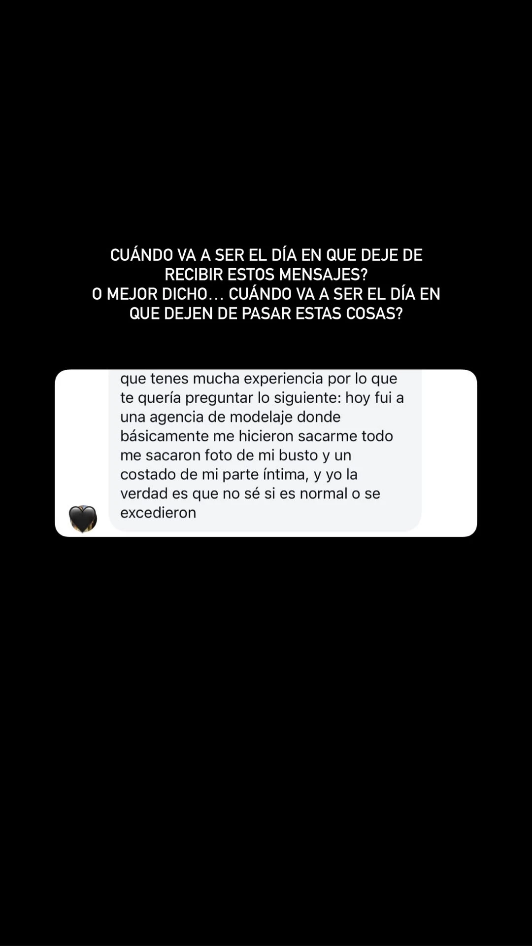 Sobre el final del video, destacó la importante de ponerle freno a este tipo de abusos por ninguna agencia o escuela. "Sé que es el sueño de muchas chicas porque era el mío. Por eso empatizo tanto y sé las ganas que uno tiene de crecer y de quedar en el casting. Sepan que es pasito a pasito. Te piden una foto en bolas y es un NO", aconsejó.