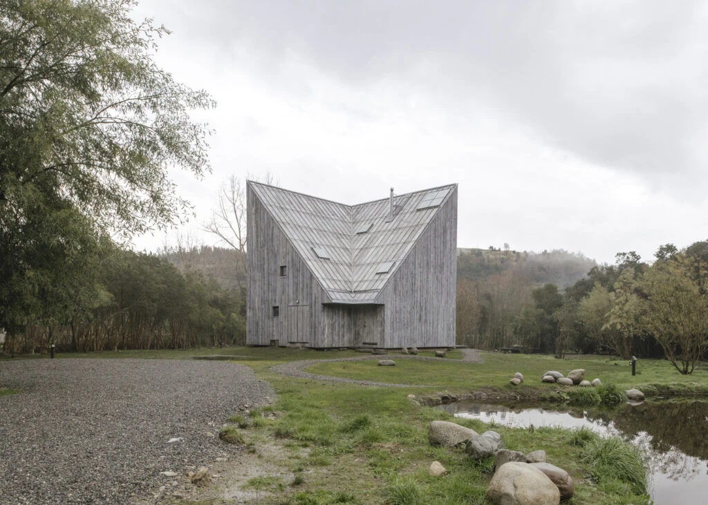 La rugosidad del material resalta sobre los distintos tonos de gris dando un aspecto atemporal a la casa que se mezcla con las mañanas de neblina.