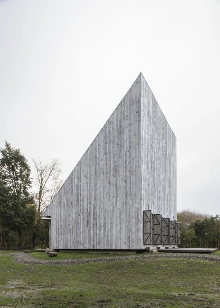 La casa se ubica en el sur de Chile, en un claro natural de un largo terreno que remata en un lago.