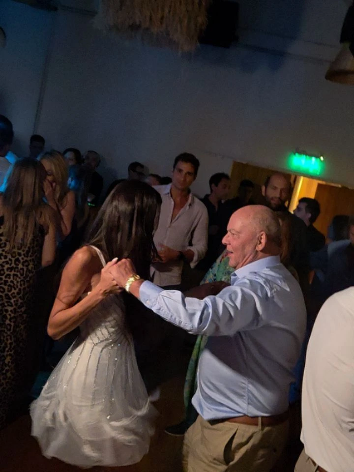 Para la fiesta, Emily cambió de look: dejó atrás la pollera larga y el top, y optó por un vestido corto, modelo solero, también blanco, que combinó con botinetas plateadas, sumando comodidad y estilo para bailar y disfrutar de la noche.