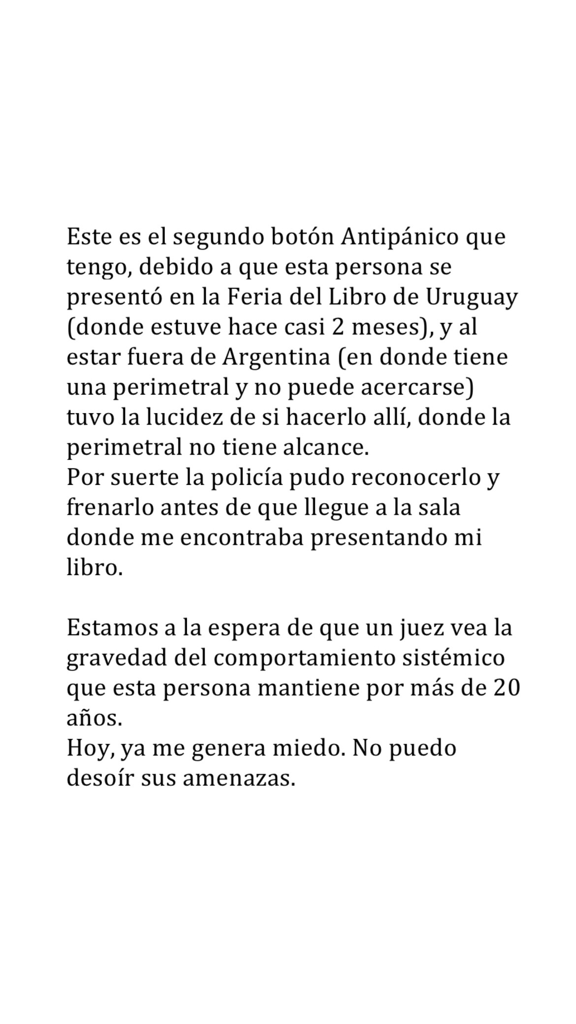 Allí, la actriz se sinceró con los sentimientos que esto le genera. "Ayer pensaba: por qué termino yo con la sensación de ser la que está “encerrada”, con un botón Antipánico y un policía en la puerta de mi casa cuidándome de las amenazas? No debería ser al revés? Yo caminando tranquila por la calle, yendo y viniendo, y él recibiendo el tratamiento adecuado?", se lamentó.