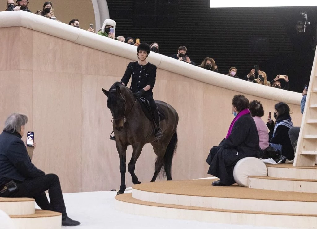 Con una gran puesta en escena, el desfile tuvo una gran sorpresa para todos los presentes, Charlotte Casiraghi, embajadora de Chanel, debutó como modelo sobre la pasarela arriba de un caballo.
