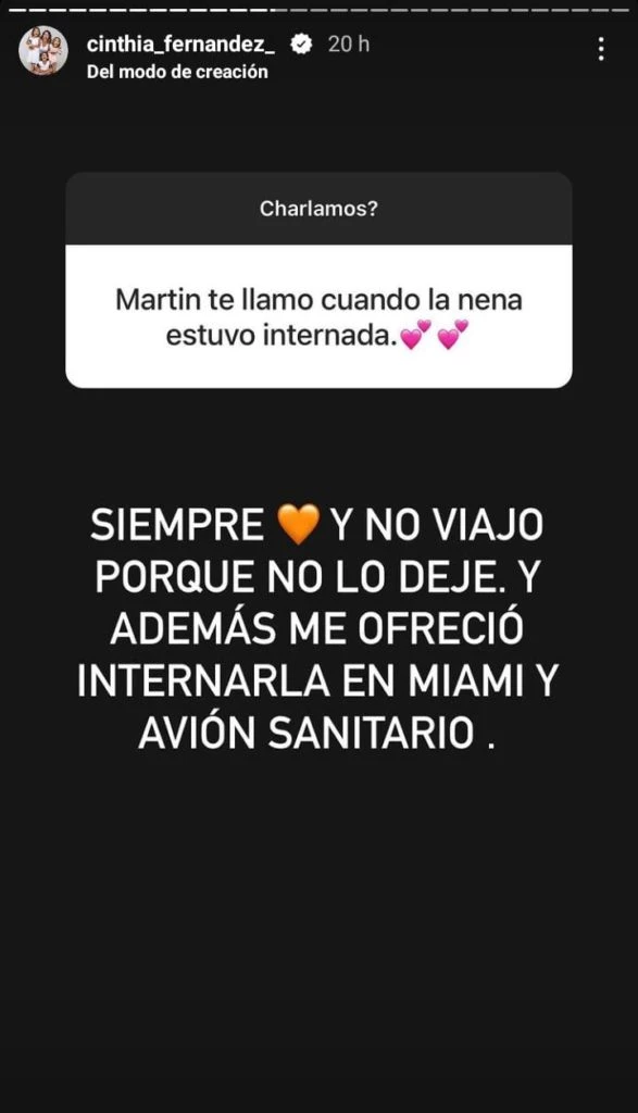 A través de Instagram, varios seguidores le consultaron sobre cómo actuó su ex, Martín Baclini, ante la internación de la niña. Como es de público conocimiento, el hombre logró establecer un vínculo muy cercano con la niña y así lo demostró mientras peligraba su salud. "No viajó porque no lo dejé. Además, me ofreció internarla en Miami y avión sanitario", destacó.