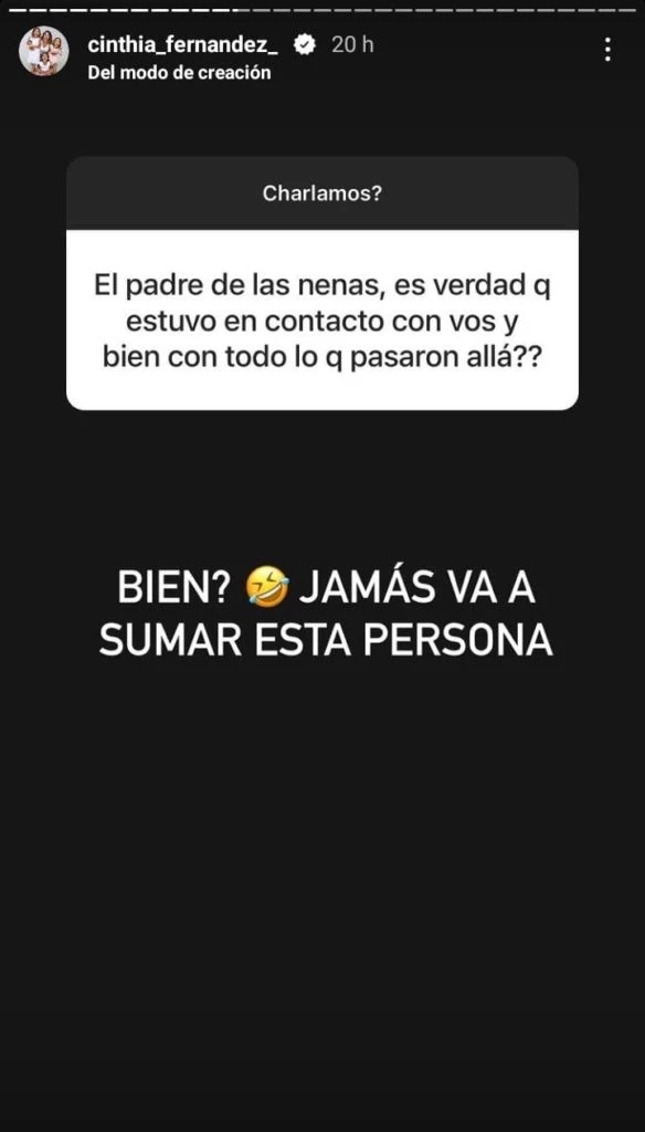 Sin embargo, se mostró muy diferente cuándo preguntaron por Matías Defederico, el padre de sus hijas. "¿Es verdad que estuvo en contacto con vos y bien con todo lo que pasaron allá?", fue la consulta a la que Fernández tuvo una respuesta contundente. "¿Bien? Jamás va a sumar esta persona", escribió muy molesta.