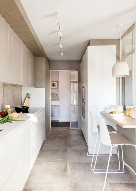 Si tu cocina se extiende en un espacio largo y estrecho, nada mejor que utilizar colores claros, tanto en el mobiliario como en los revestimientos.