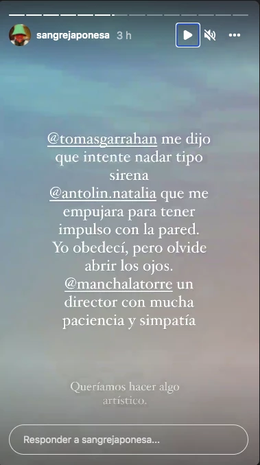 "Natalia Antolín que me empujara para tener impulso con la pared. Yo obedecí, pero olvidé abrir los ojos", continuó. "Mancha Latorre un director con mucha paciencia y simpatía", completó, mencionando a todos sus amigos, quien intentaban hacer una filmación subacuática de la actriz.