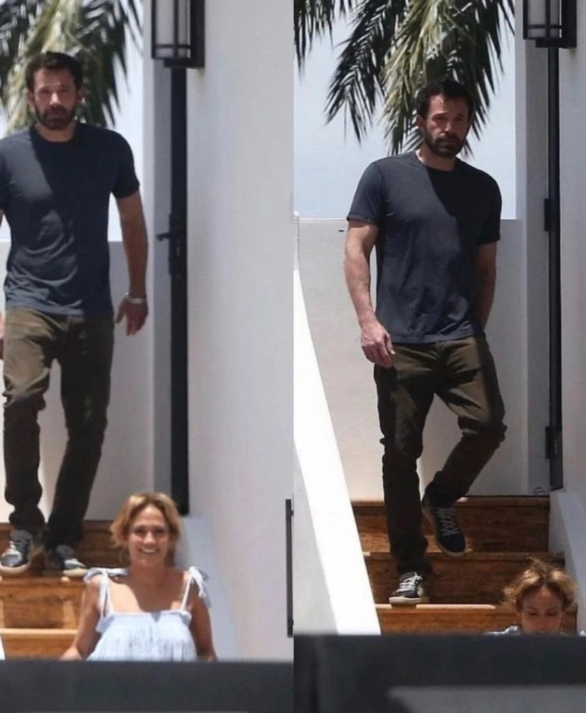 En la imagen se la ve a J.Lo muy sonriente mientras bajaba un tramo de escaleras afuera con Ben siguiéndola de cerca.