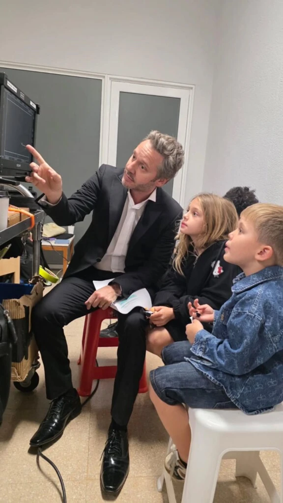 En una historia que compartió en Instagram, se lo ve sentado en un banco, elegantemente vestido con traje, mientras les muestra a sus pequeños una cámara de grabación. La escena, que parece haber sido parte de una jornada de trabajo, reflejó un clima distendido y de aprendizaje compartido.