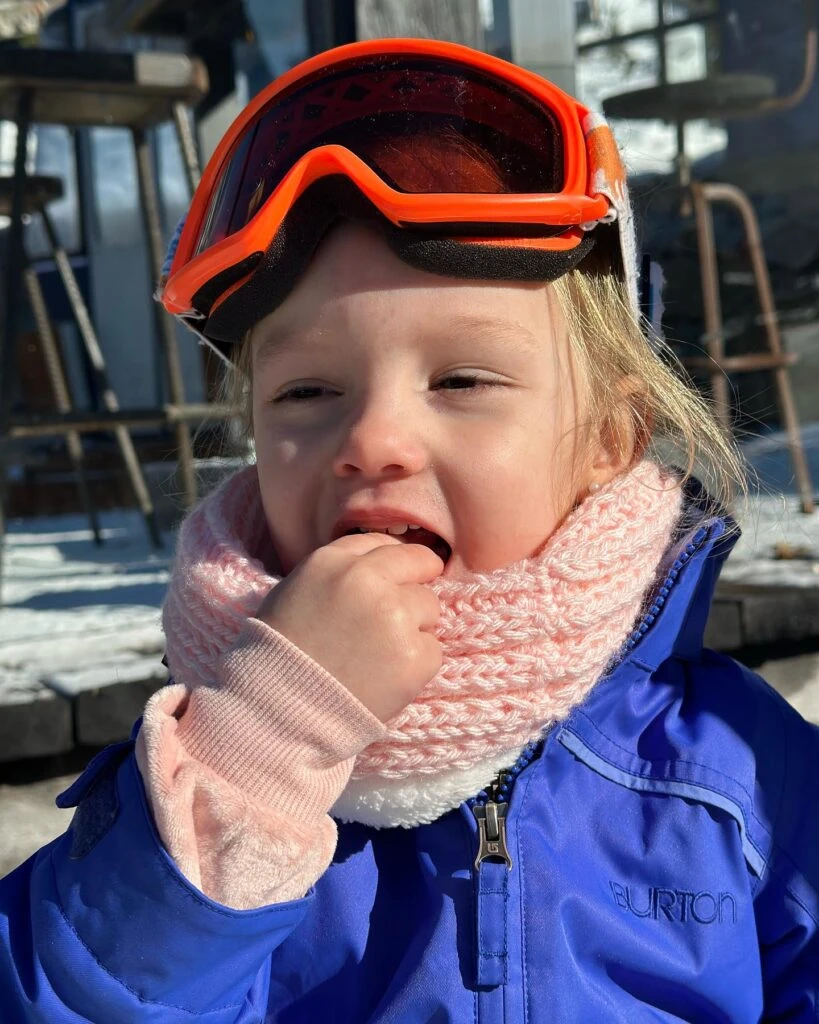 Desde el perfil de Anita, Pampita compartió varias imágenes de sus vacaciones en Villa La Angostura. Para su jornada de nieve, la pequeña se lució con un mono azul eléctrico que combinó con complementos muy coquetos: una bufanda tejida rosa, guantes negros con lunares blancos y antiparras naranjas con una correa de ajuste estampada.