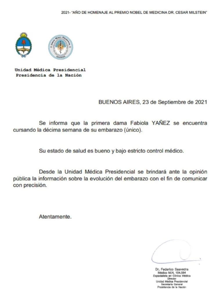 Fabiola Yáñez está cursando la décima semana de un embarazo. Según el comunicado firmado por el médico presidencial, Federico Saavedra, el estado de salud de la esposa de Alberto Fernández es bueno y se encuentra "bajo estricto control médico".