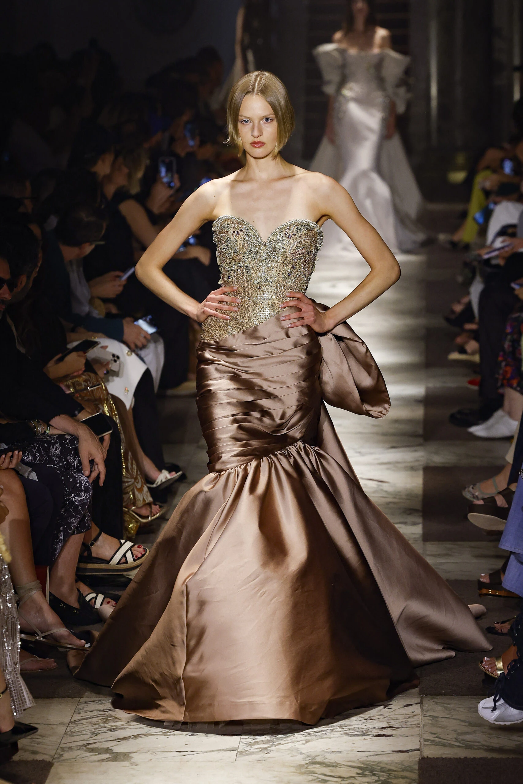 Minimalismo vs. Exceso: el lujo silencioso se combina con el maximalismo que explota en volúmenes, brillos, plumas y flores gigantes.