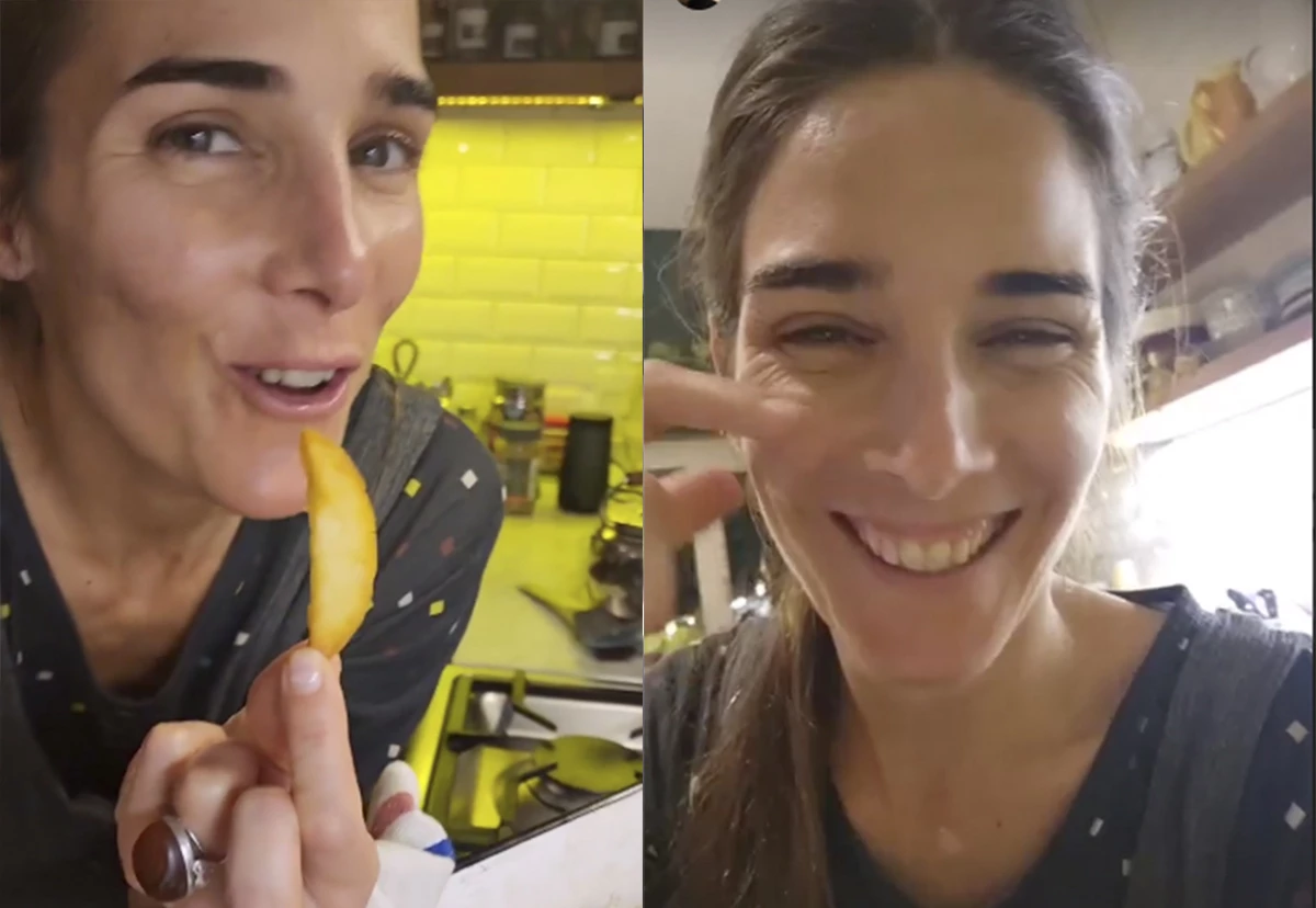 Durante la preparación de las papas, que peló y cortó cuidadosamente en bastones gruesos, luego secó y cubrió con aceite, mezclando con las manos para que todas las papas se mojen bien, se escuchó la voz de Goldenhorn mientras grababa todo el proceso para subirlo a Instagram.