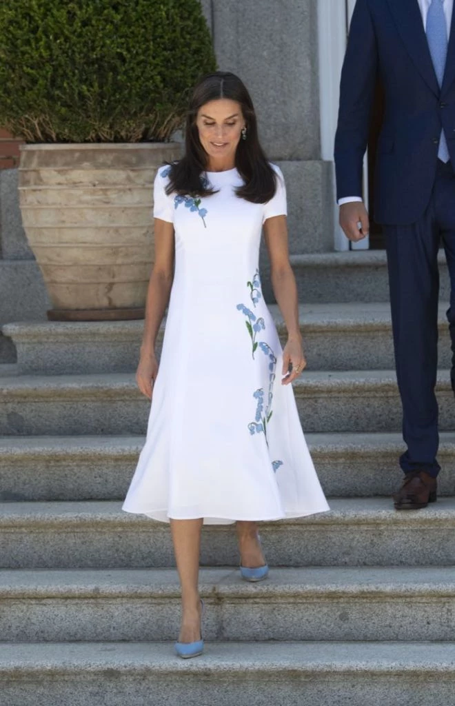 La prenda más cara que usó Letizia fue el vestido de Carolina Herrera que estrenó para dar la bienvenida al Emir de Qatar, Tamim Bin Hamad Al Thani, y su esposa, Jawaher Bint Hamad el pasado mes de mayo. Un diseño blanco de largo midi con un bordado floral azul que estaría valorado en 5.847 euros.
