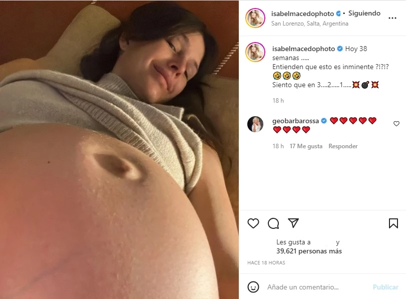 En esta oportunidad, la actriz subió una impactante foto en la que se la ve acostada y mostrando su vientre. Además, hizo referencia al poco tiempo que falta para el nacimiento de su niña: "Hoy 38 semanas... ¿entienden que esto es inminente? Siento que en 3, 2, 1...".
