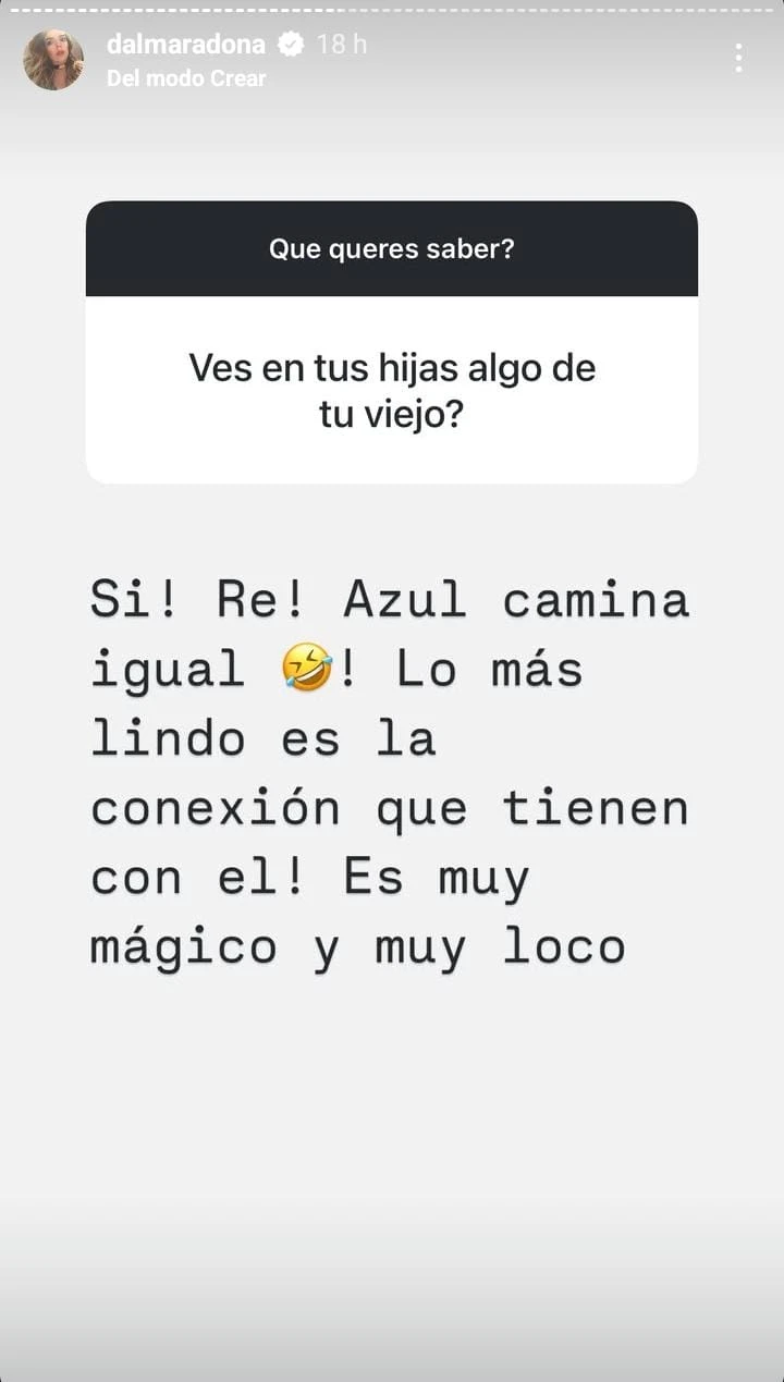 Por otro lado, sus seguidores le consultaron si veía alguna similitud en sus niñas a su padre, Diego Maradona. "¿Ves en tus hijas algo de tu viejo?", le preguntaron vía Instagram. "Sí, re. Azul camina igual, es la conexión que tienen con él. Es muy mágico y muy loco", fue su emotiva respuesta. A su vez, reveló que ambas son fanáticas del Club Atlético Boca Juniors al igual que el resto de la familia.