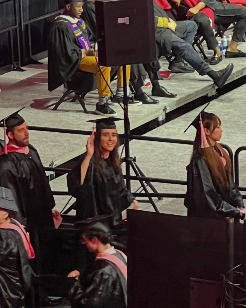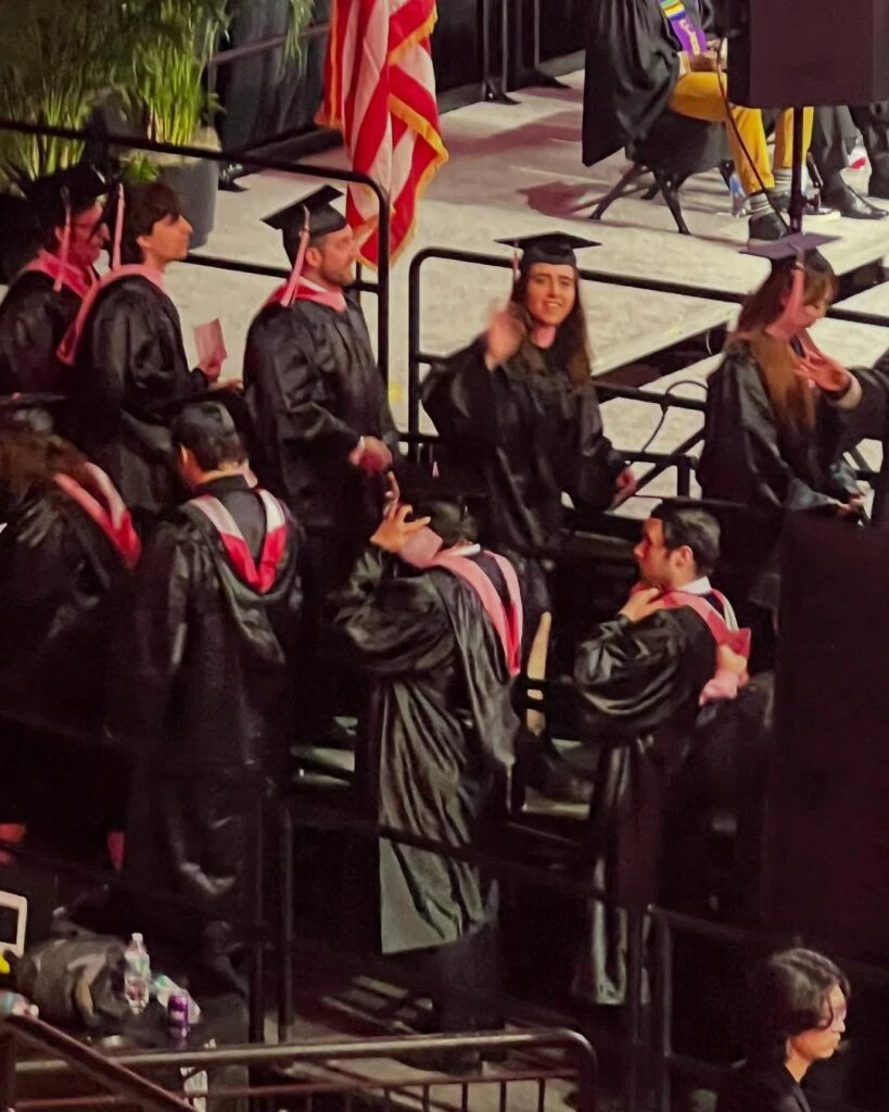 Con toga y birrete, y visiblemente emocionada, la hija de la periodista María Laura Santillán forma parte del grupo de egresados que recibe su diploma. En las fotos se la puede ver saludando con una gran sonrisa, lo que refleja el orgullo y la felicidad del momento.