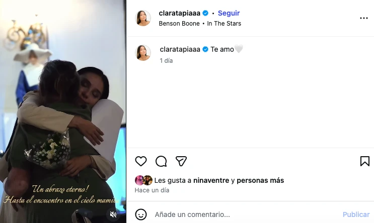 En otro posteo, la hija del Chino Tapia compartió un breve video donde aparece uniéndose en un cálido abrazo con la mujer. “Un abrazo eterno! Hasta el encuentro en el cielo mamita”, escribió. En pocos minutos, la publicación se llenó de mensajes de condolencias, deseando fuerzas en este difícil momento.