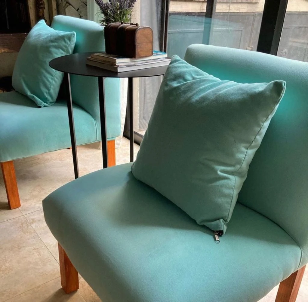 Lindísimas las sillas, en agua marina, que eligieron para otro sector del living donde suelen sentarse a tomar mate y disfrutar de la vista al jardín.