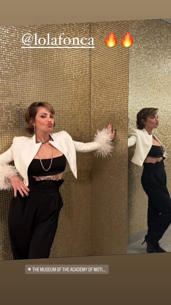 Además, la actriz lució un pantalón cintura alta y top bandeau, ambos en tono negro. Complementó con accesorios varios, incluyendo una minicartera, con cadenas, y unas botas con taco. El resultado: un glamoroso black and white, que conquistó en una gala muy especial. Recordemos que María Gorof será también la encargada de vestirla en la ceremonia de los Premios Óscar.