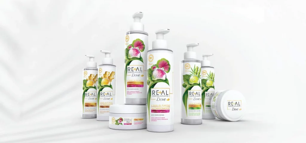 La línea Dove Real Poder de las Plantas se compone de shampoo (botella de 300ml), acondicionador (botella de 300ml) y mascarilla (pote de 190ml) con propuestas diferentes para cada necesidad del consumidor/a:
