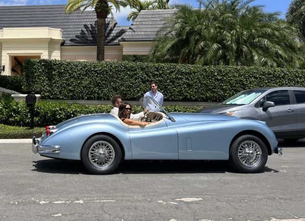 En unas de las primeras imágenes que han salido a la luz de la boda de Brooklyn Beckham con Nicola Peltz, que se celebró este fin de semana en la casa que la familia de la novia tiene en Florida, se puede ver a los recién casados viajando en un Jaguar descapotable de color azul.