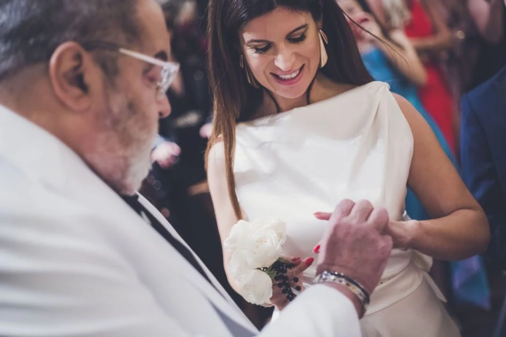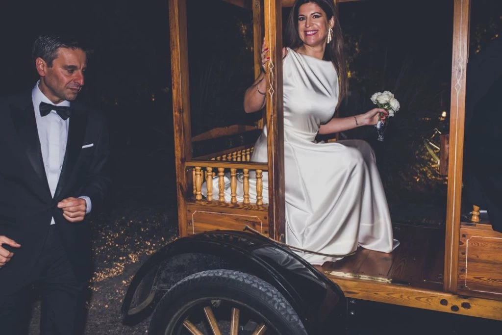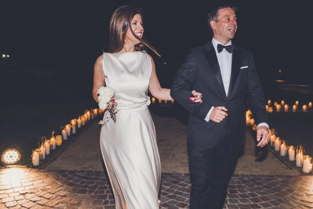 La novia, deslumbrante con un diseño de Gino Bogani, llegó en un carruaje y camino por un sendero iluminado por velas hasta el encuentro con su pareja, que la esperaba en el altar.
