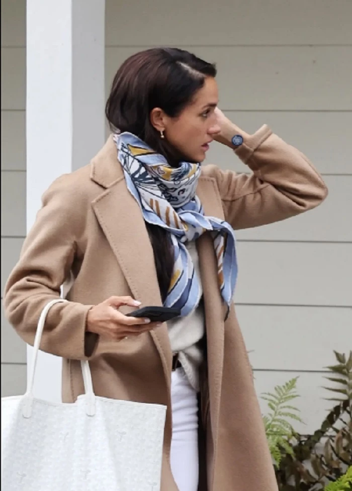 Mientras el príncipe Harry se encuentra de viaje por Asia, la mujer de 42 años estaba de paseo en las cercanías de su hogar y un extraño dispositivo llamó la atención de los paparazzi. En cuanto a su look, Markle llevaba un abrigo Max Mara color camello y un chal Hérmes de cachemir, estampado en azul, jean blanco y una tote bag haciendo juego.