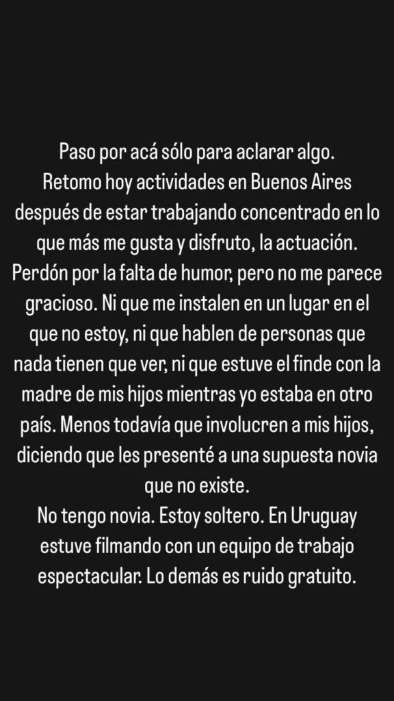Y continuó: "No tengo novia, estoy soltero. Menos todavía que involucren a mis hijos, diciendo que les presenté a una supuesta novia que no existe. En Uruguay estuve filmando con un equipo de trabajo espectacular. Lo demás es ruido gratuito". Si bien Benjamín no es de hacer este tipo de aclaraciones por sus redes sociales, esta vez quiso hacer una excepción.