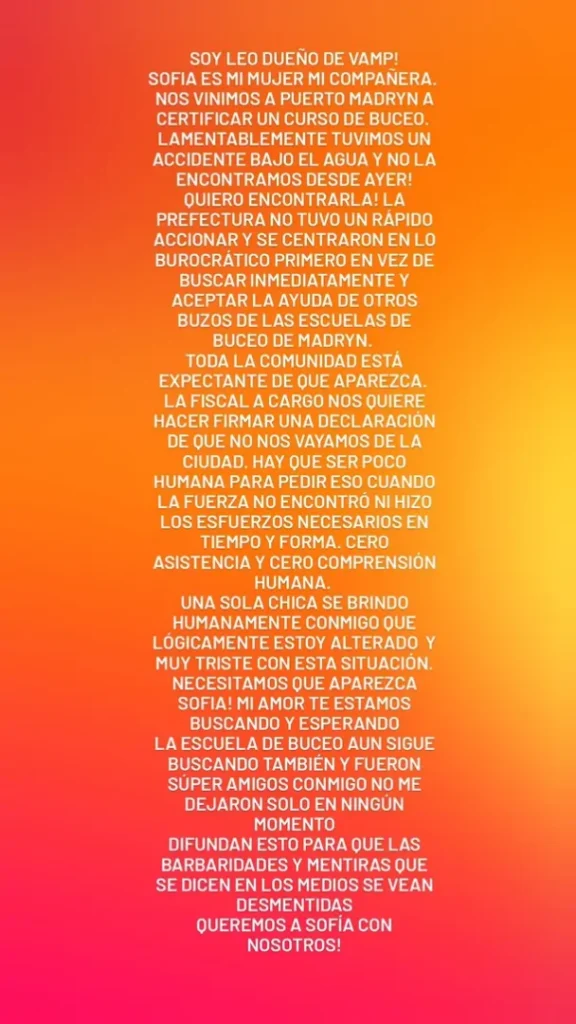 En su publicación, Leo explicó que habían viajado a Puerto Madryn para realizar un curso de buceo y que el accidente ocurrió bajo el agua. Allí relató que desde el momento del incidente no volvieron a verla.