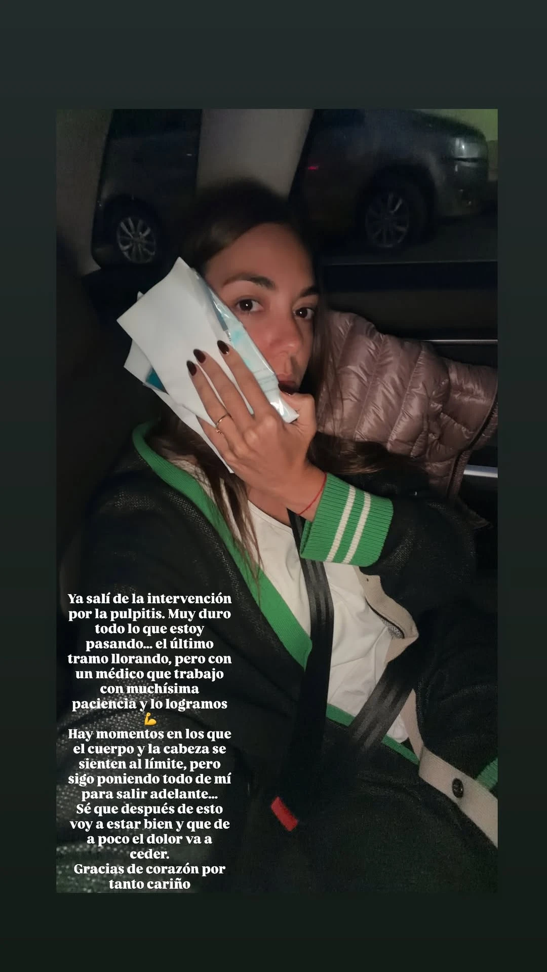“Ya salí de la intervención por la pulpitis. Muy duro todo lo que estoy pasando... el último tramo llorando pero con un médico que trabajó con muchísima paciencia y lo logramos”, escribió.