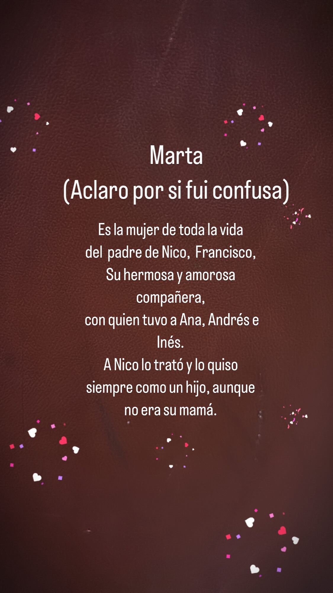 En este sentido, explicó: "Es la mujer de toda la vida del padre de Nico. Su hermosa y amorosa compañera con quien tuvo a Ana, Andrés e Inés. Lo trató y quiso siempre como un hijo aunque no era su mamá".