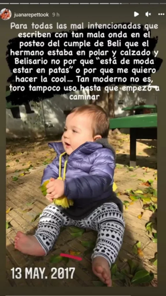 La actriz no dejó pasar esos comentarios y sentenció: "Para todas las mal intencionadas que escriben con tan mala onda en el posteo del cumple de Beli, que el hermano estaba en polar y calzado y Belisario no 'porque está de moda estar en patas' o porque me quiero hacer la cool. Tan moderno no es, Toro tampoco usó hasta que empezó a caminar".